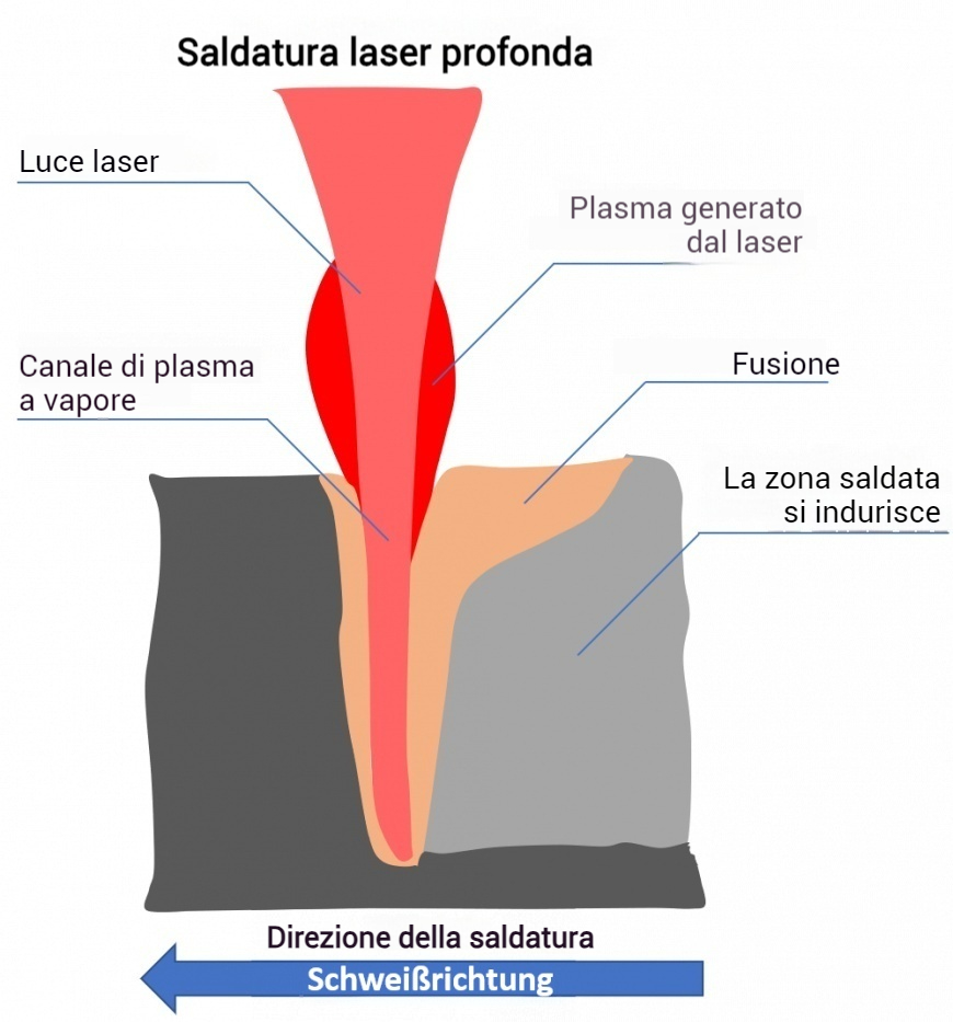 Il nostro laser da 7000W ha un'intensità molto alta, che permette alla temperatura della giunzione di raggiungere il punto di evaporazione, consentendo di effettuare saldature profonde.